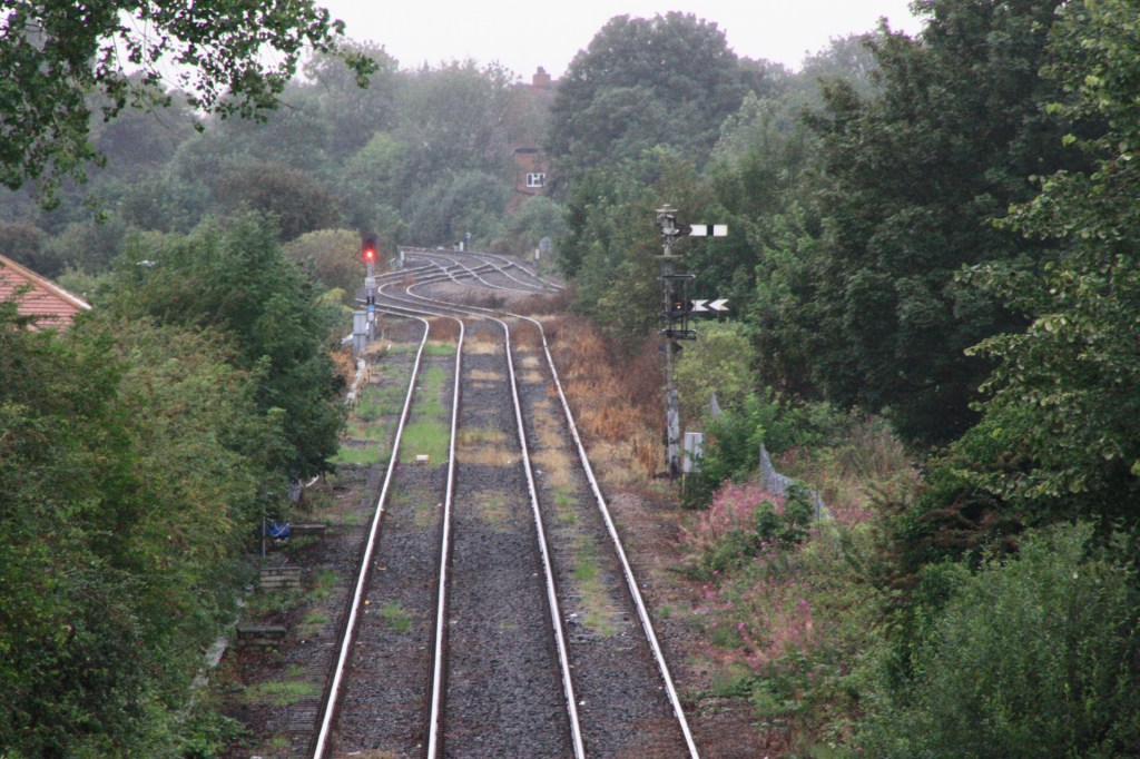 Moving on from here, my next call was a crossing close to the boarded up Norton East box, which is close to a modern galvanised steel bracket controlling the east side of the Norton triangle. Looking west there are down home and distant signals protecting the north and east sides of the triangle, the latter obscured behind sighting boards.