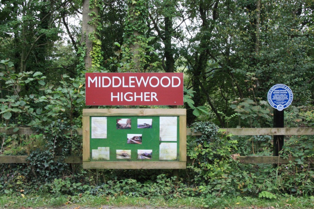 The former route crosses immediately above Middlewood station, where there is a board giving a potted history of the Macclesfield, Bollington and Marple Railway (closed to passengers in 1960 and freight a decade later), with the name board pictured above marking the site of the former Middlewood Higher station.