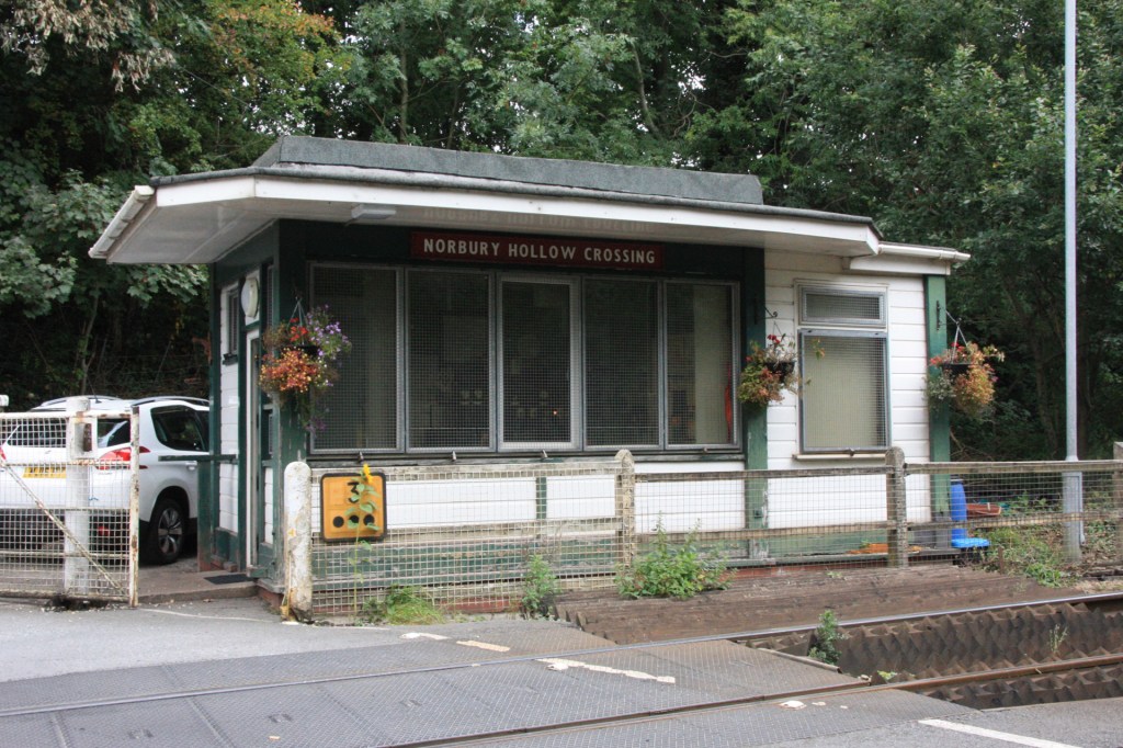 Norbury Crossing is a charming spot where one of the signallers clearly takes a great deal of time to maintain an impressive floral display. Apart from the distant signal, which is lever 4 in its 6-lever frame, the other semaphore is down home (3) that stands just south of the crossing. One other signal controlled by the crossing is a colour light up home signal (2).