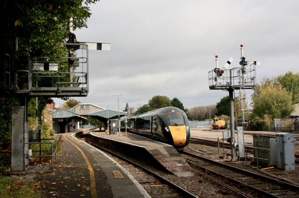Yeovil Pen Mill is a rather delightful spot, 141¼ miles from Paddington, and the only place that these diverted GWR services will encounter semaphore signalling on their journey to Plymouth, with an unusual mixture of upper and lower quadrant arms controlled by Pen Mill signal box.