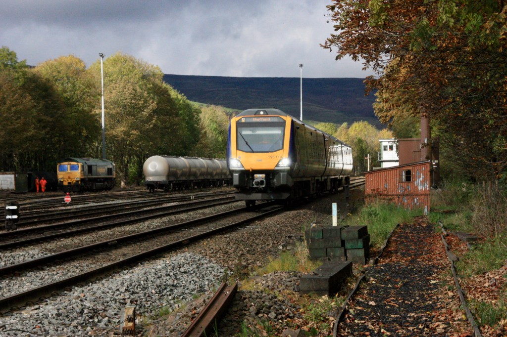 In addition to the regular diet of freight action, passenger services passing Earles Sidings comprise hourly Manchester-Sheffield stopping services, largely in the hands of new CAF Class 195 units, TPE Cleethorpes-Manchester services (Class 185s), and EMR Liverpool-Norwich workings (Class 153/6/8).