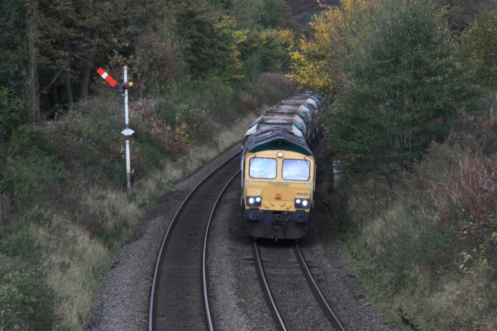 Freightliner 66620 approaches Earles Sidings with aggregates from Tunstead Sidings to Radlett Redland Roadstone
