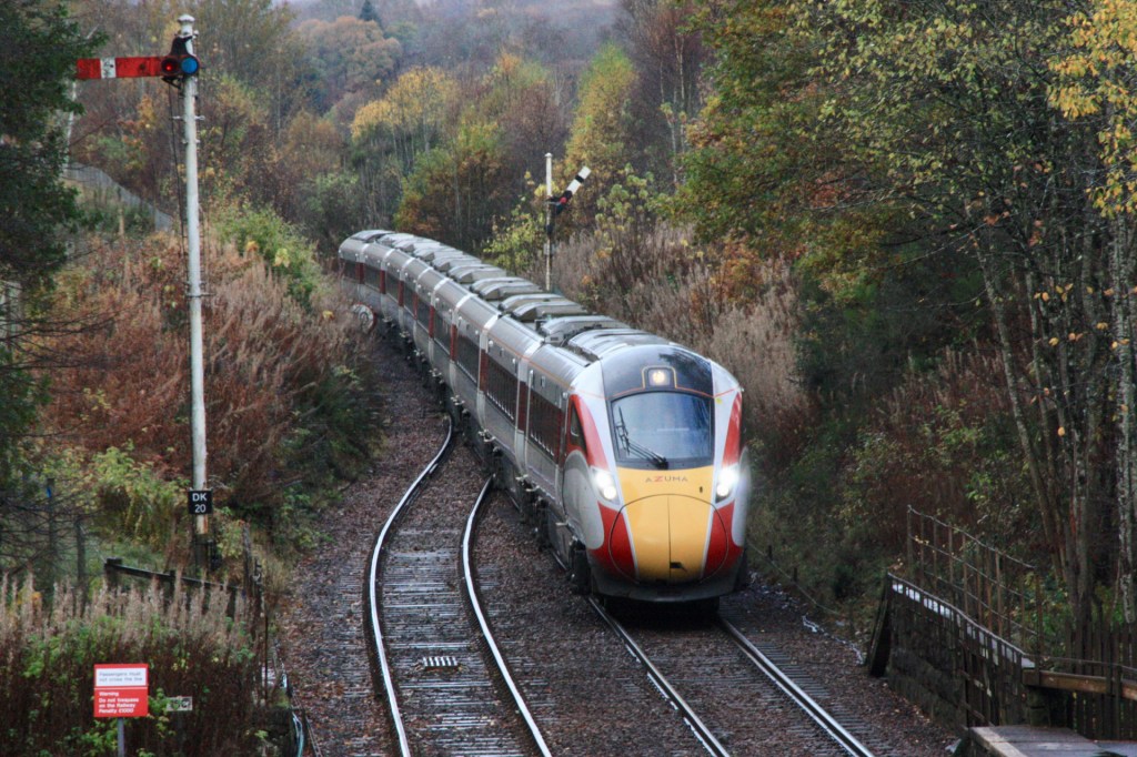 LNER Azuma 800111 approaches Dunkeld on 3 November 2020 with the up “Highland Chieftain” – 07.55 Inverness-London Kings Cross (1E13)