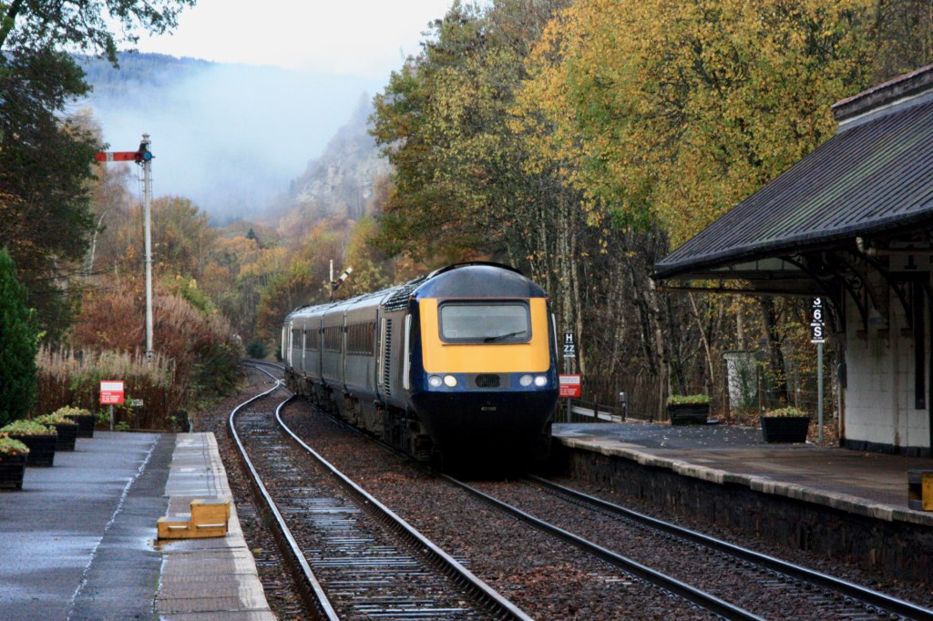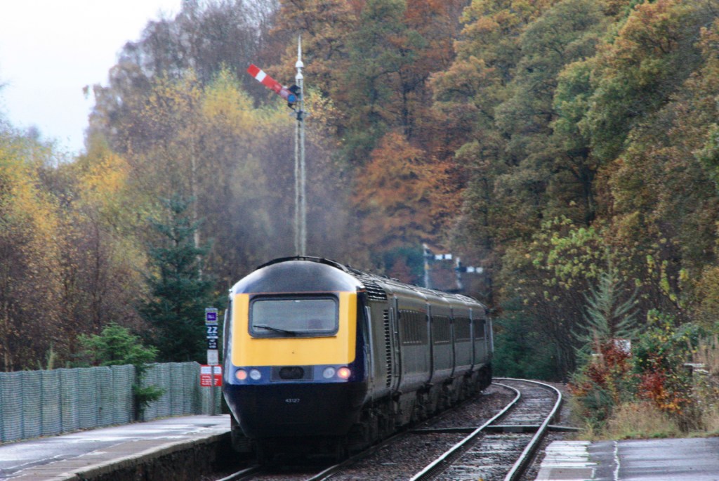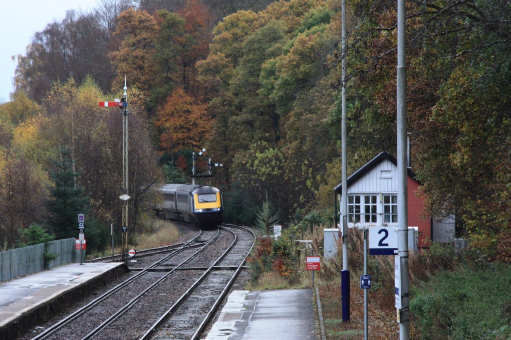 43150/127 depart Dunkeld and pass DK3 on 3 November 2020 with the 08.45 Inverness-Glasgow Queen Street (1T98)