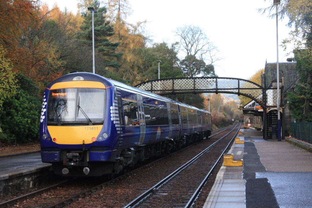 170411 passes Dunkeld Signal Box on 3 November 2020 with the 10.10 Glasgow Queen Street-Inverness (1H09)