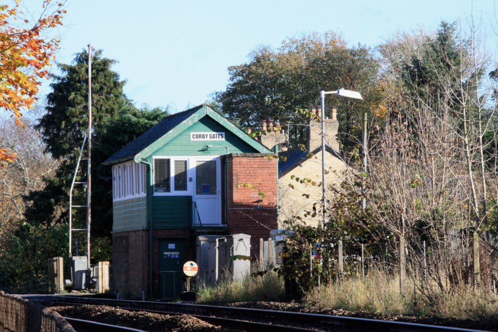 Corby Gates Signal Box (pictured above) stands just around the corner from the eastern end of the viaduct and is a British Railways (NER) Type 17 design dating from 1955 that is built on the base of a previous North Eastern Railway box, which has a letter box built into its end wall.