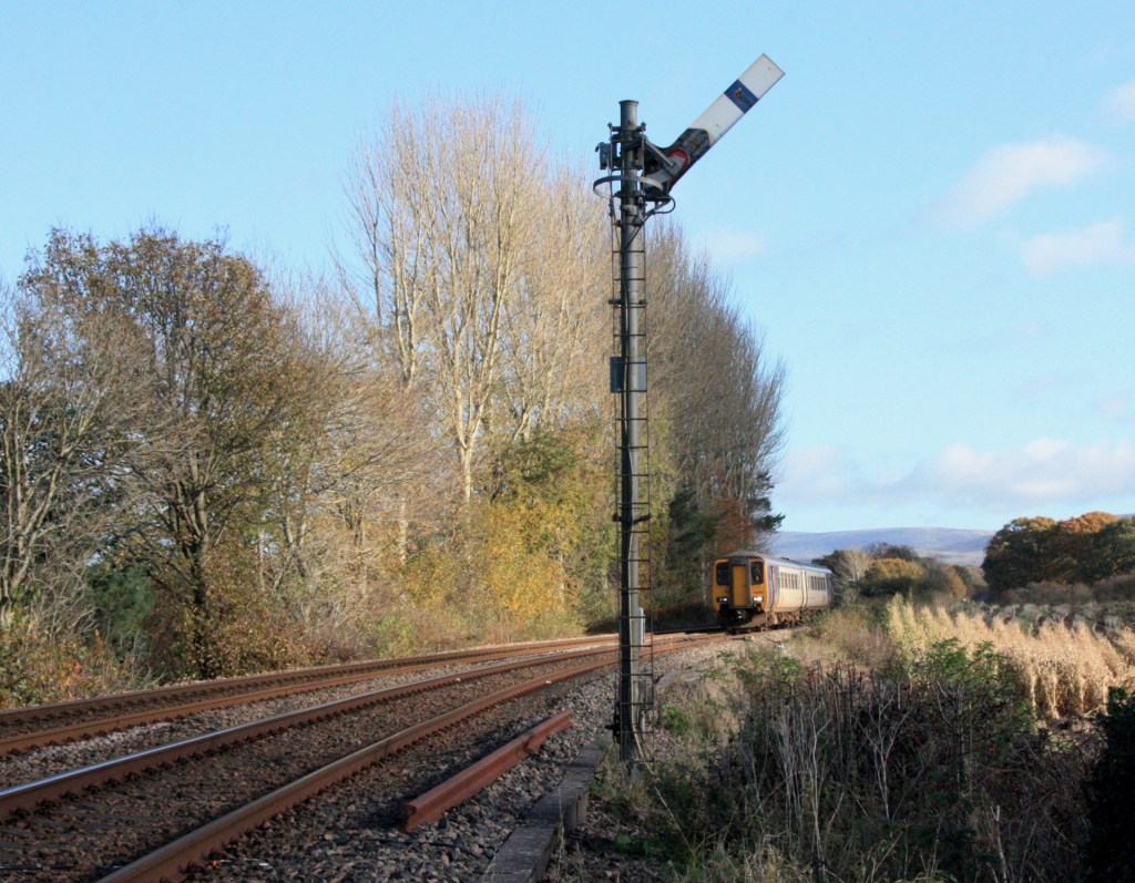 From this point the line curves round to the right, and for a great vantage point to see and photograph Corby Gates’ third semaphore it is well worth the ten-minute walk towards the village of Great Corby then turning left and heading north on Sandy Lane to a foot crossing of the line close to the motor-worked down outer home signal.