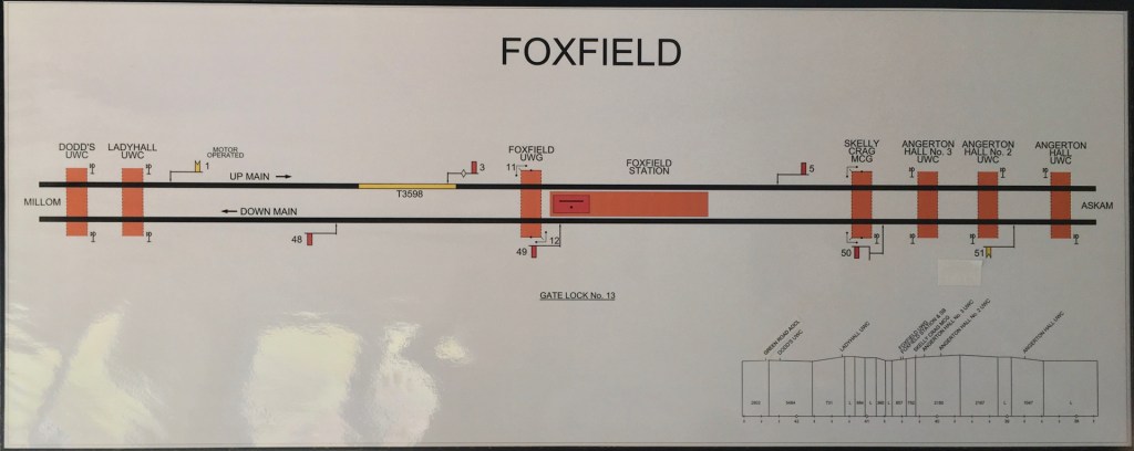 Given the small size of surviving adjacent boxes at Askam and Millom, it is interesting to wonder why a remote spot like Foxfield was equipped with such a large box and 52-lever frame, of which only seven, plus three gate locking levers, remain in use today, with no crossovers, sidings or shunting discs whatsoever.