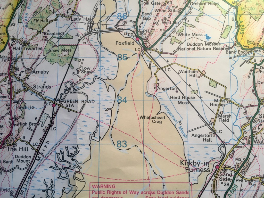 As can be seen from this extract of OS map 96, a path runs parallel to the railway as far as a place called Angerton Hall, where a User Worked Crossing (UWC) of the line gives you a distant view looking north along the dead straight section of line to FD51, around a mile south of Foxfield.