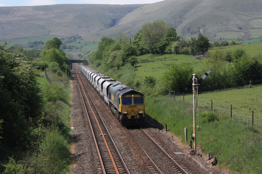 Seeing freight workings at Edale is a bit hit or miss, with RTT showing a whole range of services to and from the Peak Forest quarries and cement workings from nearby Earles Sidings. But many of these seem to not operate and there is a large element of chance in what actually runs.