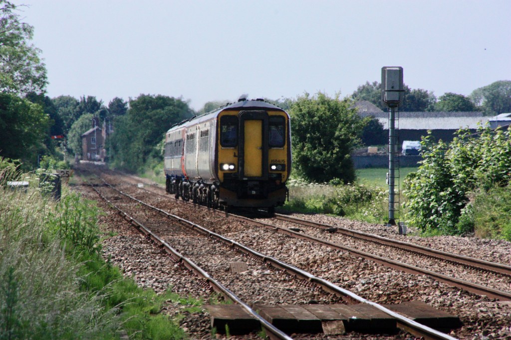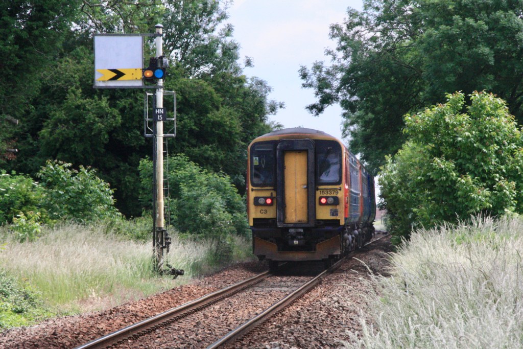 Having trekked to this automatic half barrier crossing in the hot sun it was not my lucky day to see trains passing distant signals in the off position when HN1 was only belatedly pulled off just as the train I had come to photograph (formed of 153379/156479) was passing the signal!