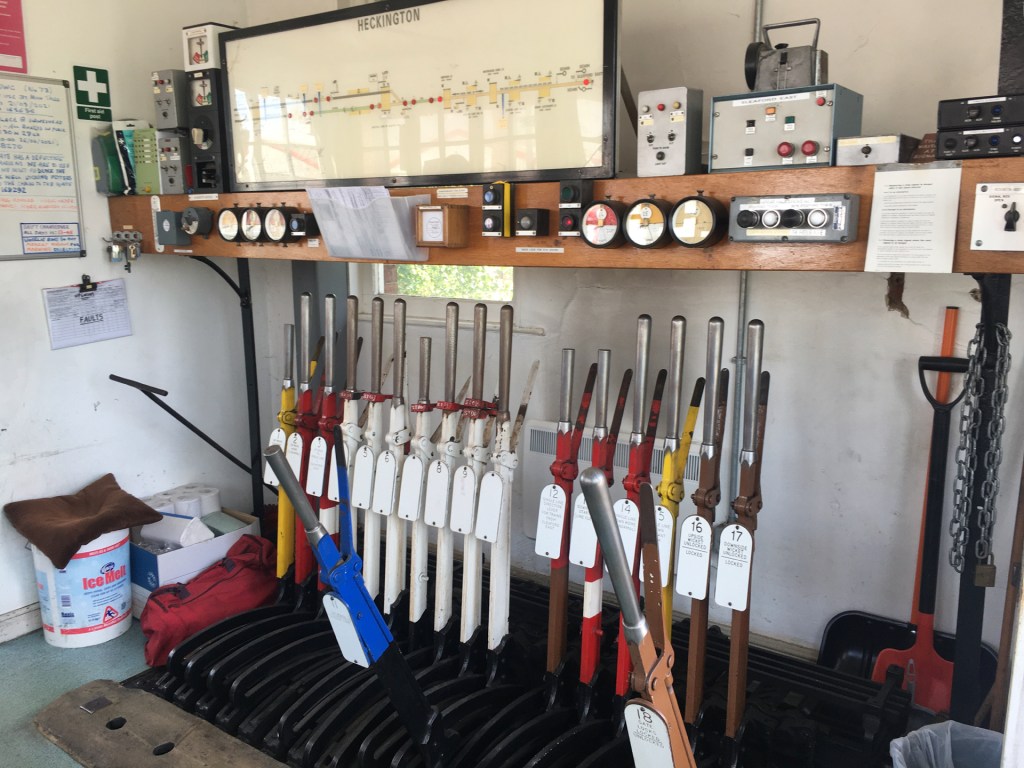 Today the 18-lever Saxby & Farmer frame, which dates from 1925, controls a total of five semaphore arms, as seen in the diagram above, closest of which to the box is up starter HN3 on a tall and modern square galvanised steel post that looks rather incongruous in this historic setting.