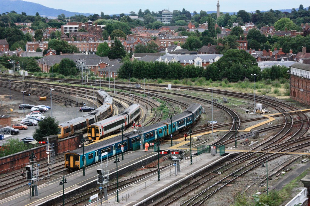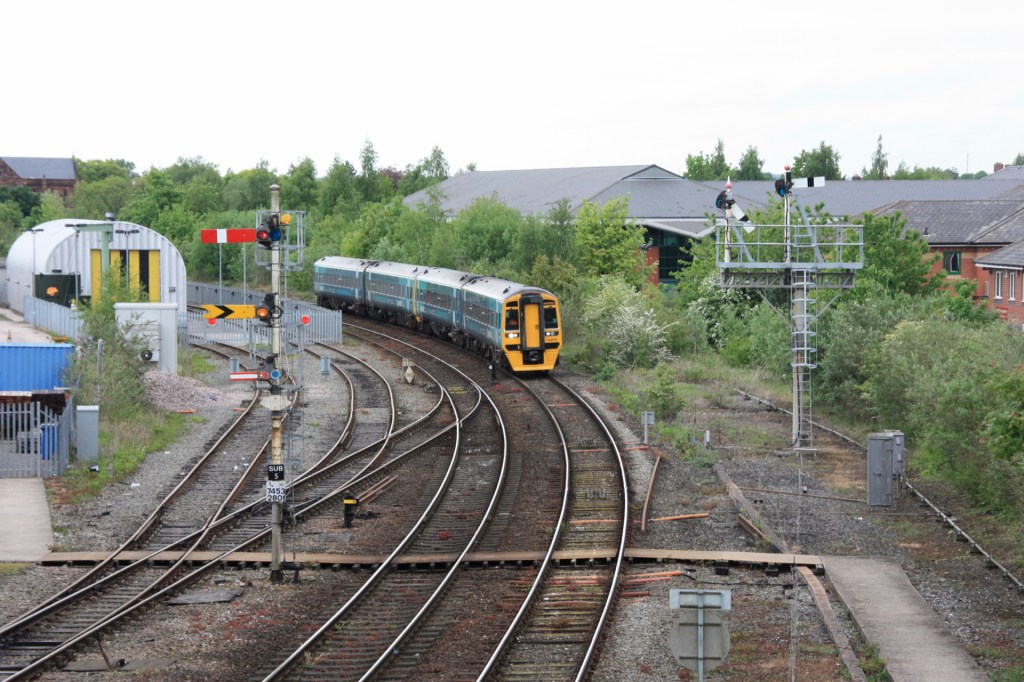 The two views here show 150229/262 departing with 1I48 from Holyhead (11.49) to Birmingham International, firstly passing the station’s most notable signals (SBJ11 – above) then heading east towards Abbey Foregate Signal Box, where both upper and lower quadrant signals are evident. Laura’s Tower is a must visit for any enthusiast visiting Shrewsbury and is completely free to enter whenever the Castle is open to visitors.