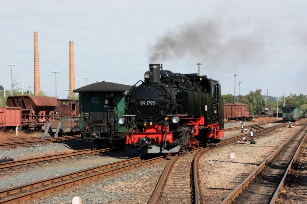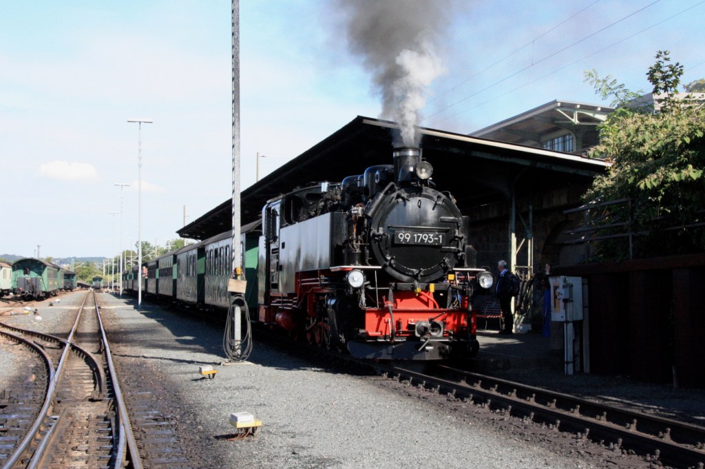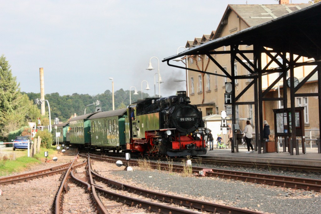 While the powerful 2-10-2 tank engines that are the mainstay of the German narrow gauge systems all look remarkably similar, there was a considerable age difference between the two locos I travelled on and photographed. The working Lößnitzgrundbahn loco (99-1747) was built in 1929, whereas the loco working from Freital-Hainsberg (99-1793) was one of the much later “Neubau” (new build) engines and only dates from 1957.