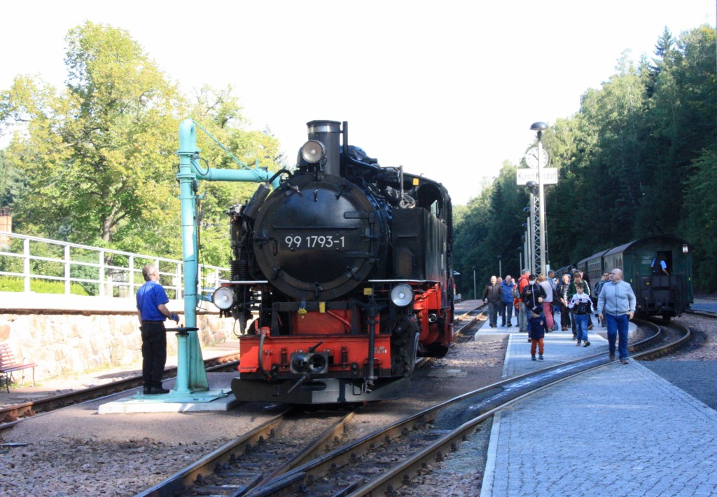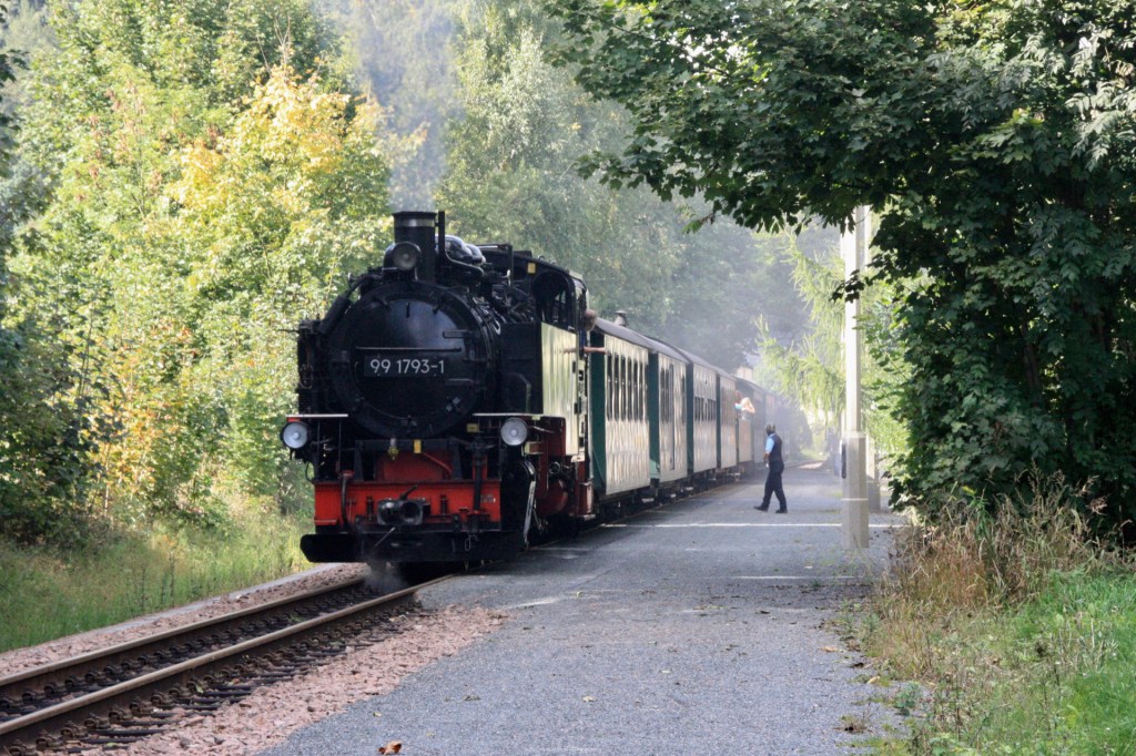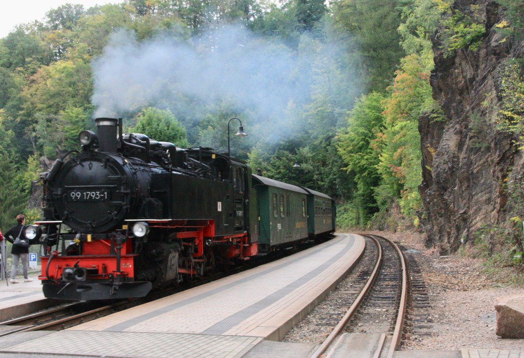Given its greater length and the lack of a school train, the Weißeritztalbahn service is rather more sparse, comprising two full length round trips of the line, departing Freital-Hainsberg at 09.25 and 13.25, which return after a 20-minute pause from Kurort Kipsdorf at 11.11 and 15.11, before a short working at 17.05 to Dippoldiswalde, returning from there at 18.02.