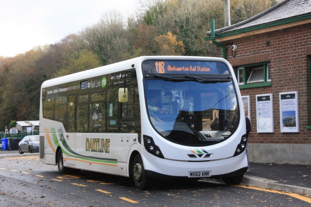 In a piece of enlightened integrated transport planning, Devon County Council has sponsored the Dartline-operated 118 bus service from Tavistock and Lydford to be extended to the rail station in most of the hours when a train is running, with a bargain-priced return fare of £3.00 from any destination and a flat fare of £1.00 for the journey down to the town centre stop that is temporarily free to anyone holding a valid rail ticket.