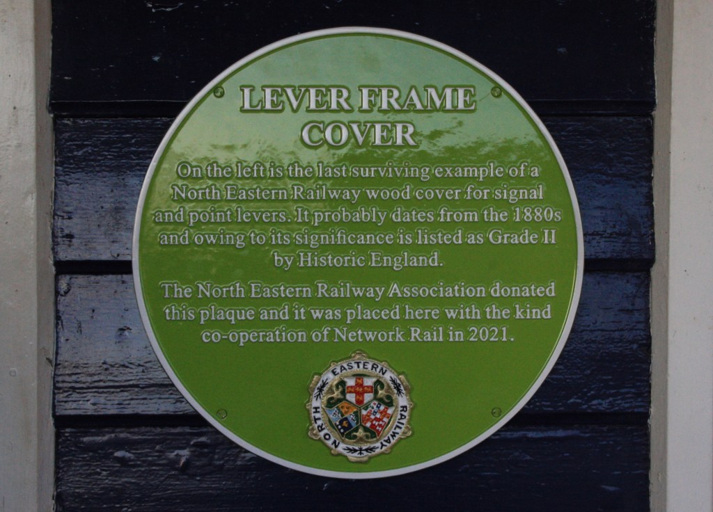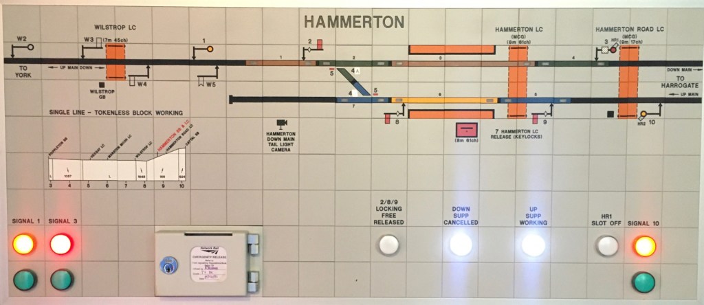 That leaves the 10-lever frame at Hammerton – whose unique housing in a large wooden cupboard on the up platform has now be commemorated with this plaque (above) – controlling three semaphores, comprising an up (eastbound) home signal H9 just beyond the level crossing gates (as seen below), an eastbound starter H8 and westbound home signal (H2).