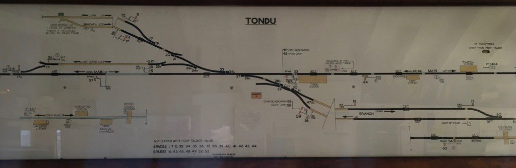 Tondu nominally remains a junction, with the remaining semaphore signals controlling entry and exit from the mothballed diversionary route to Margam, as well as a surviving stub of the closed branch line to Blaengarw, which has remained to allow any train from the Margam direction to cross and clear the Maesteg line so that a loco can run round its train and continue towards Bridgend, or vice versa.