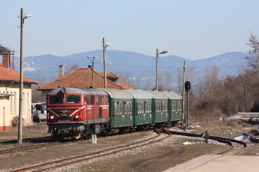 In glorious sunshine that gave me time for a leisurely visit to the loco shed, outside which stood a trio of derelict-looking steam locos (506-76, 470-60 on a wagon and 1-76, along with railcar 82-01. It also meant a chance to photograph arrival of 75-009 with the 06.25 from Dobrinishte.