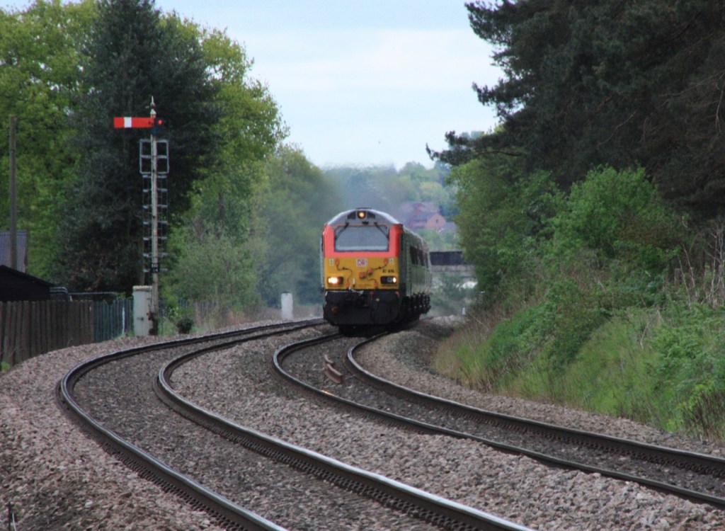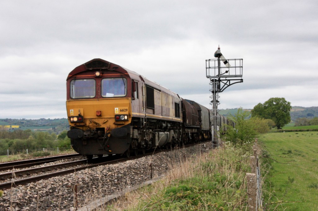 My luck was in during a morning at Bromfield on 6 May 2022 when DB 66129 in maroon livery appeared on time with the Margam train, which I was able to photograph from the field alongside the line north of the signal box as it passed down outer home signal BD28.