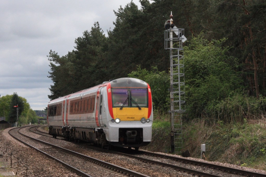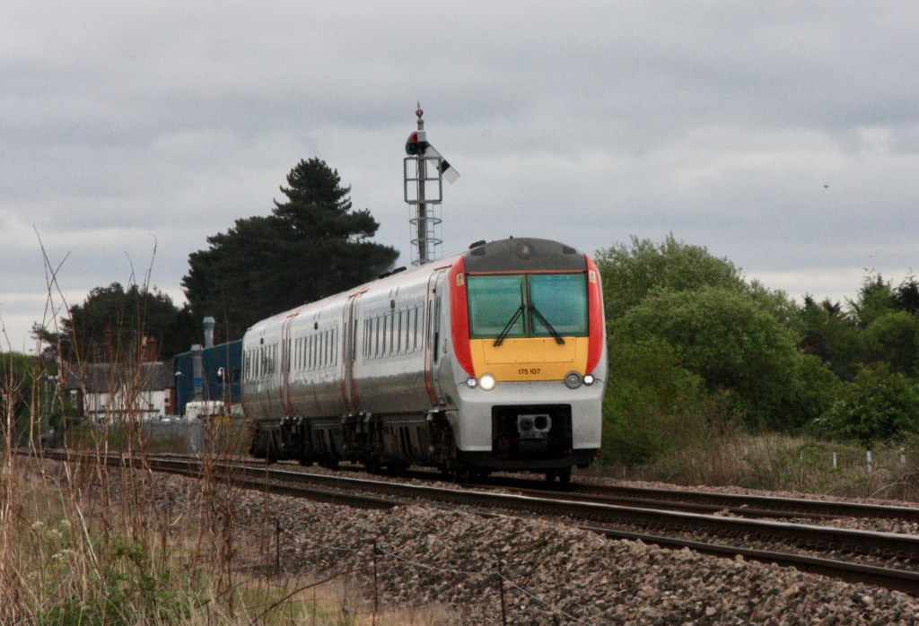 From here you can see southbound (down) trains passing section signal BD24 behind the racecourse grandstand and up trains approaching home signal BD4 as seen below where 175004 approaches BD4 with the delayed 1W56 from Carmarthen (09.00) to Manchester Piccadilly.