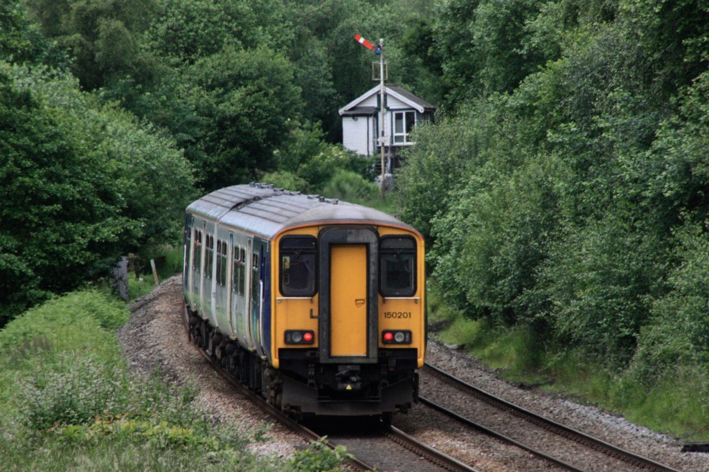 Passenger services along Mid-Cheshire route comprise hourly Class 150/156 worked trips between Manchester Piccadilly and Chester, while varied freight action includes “Binliner” trains between terminals in Manchester and an incinerator at Runcorn, bio-mass from Liverpool to Drax Power station, along with some stone and cement traffic.