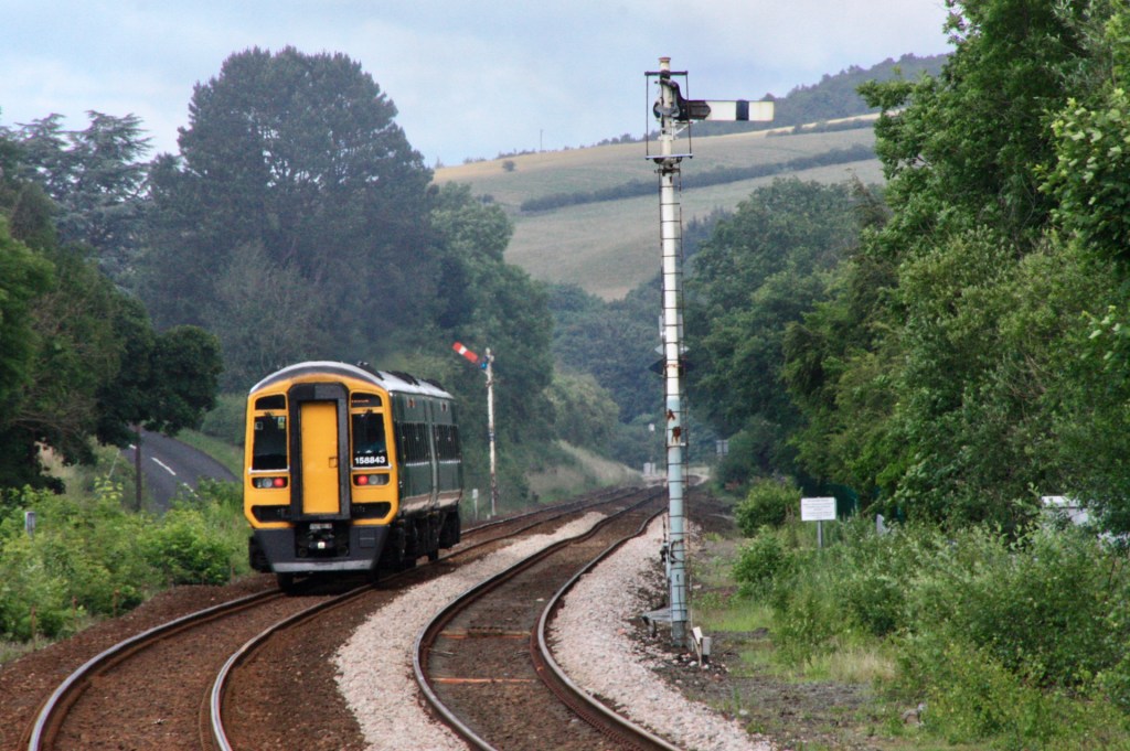 Heading east from the station along a road parallel to and north of the railway brings you to a point where the road ascends, close to signal HB10, and there is a good view looking back towards the station of trains passing HB23 as they approach the station, as seen above.