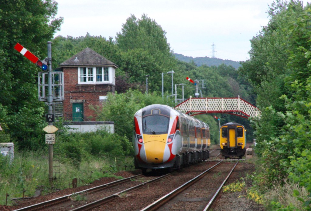 This latter signal stands some 400 yards west of the station, adjacent to a foot crossing of the line that gives a vantage point from which to see up outer home signal PE15 to the west and the other three up signals all pulled off as Newcastle-bound trains pass.