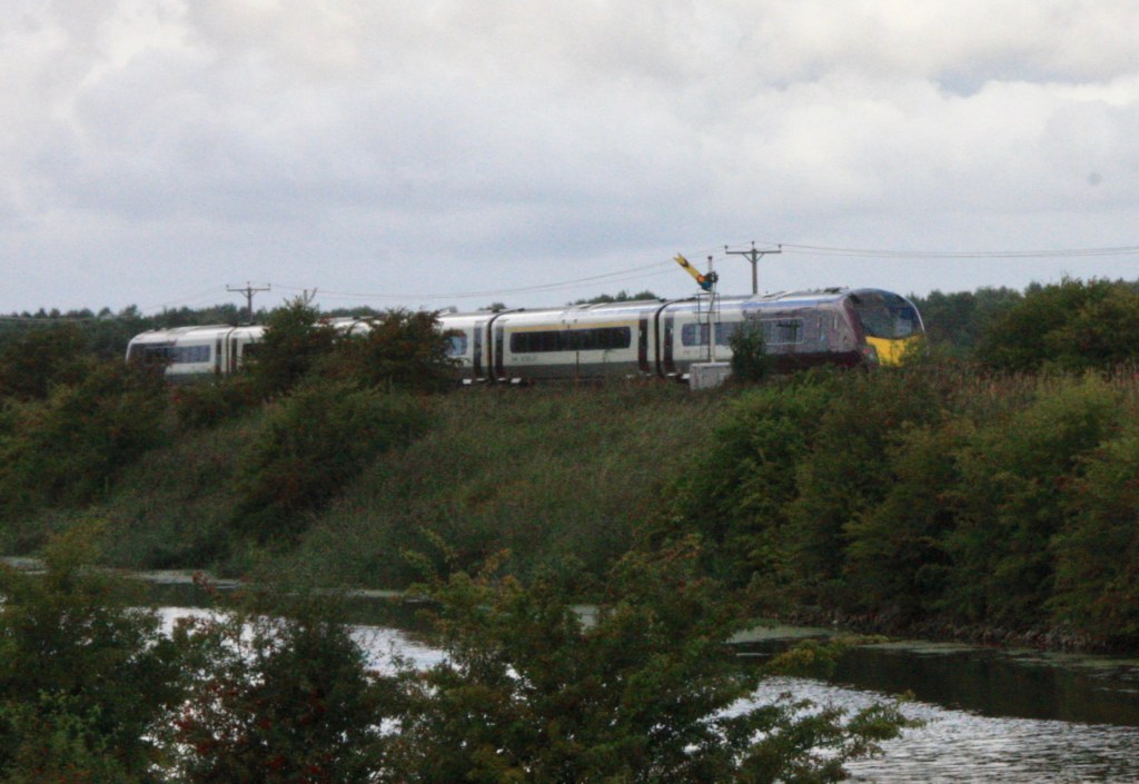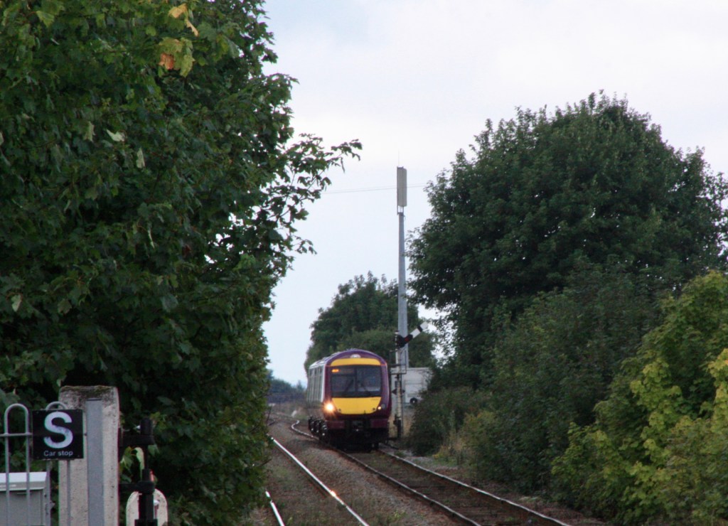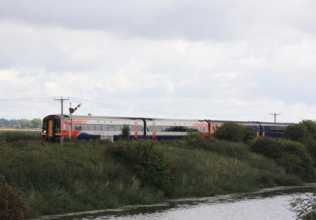 While there is a good and safe vantage point to photograph trains passing the down distant from the side of the road, at a point where road and railway curve to the south, a roadside shot of the up distant signal is rather tricky, due to the narrow verge. Instead I once again opted to get my second shot (of 1S02) from south of the wide man-made waterway known as the South Forty Foot Drain that parallels the railway on either side of Hubbert’s Bridge.