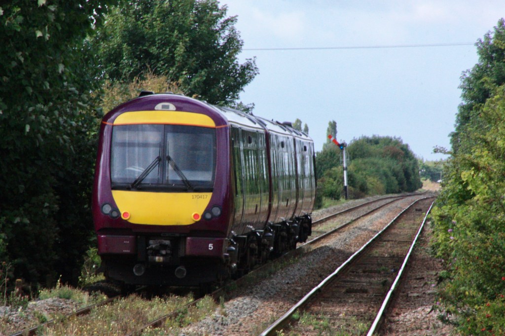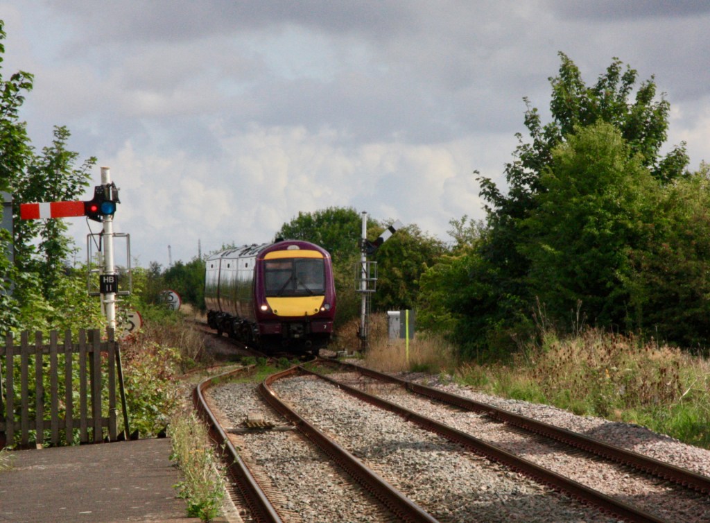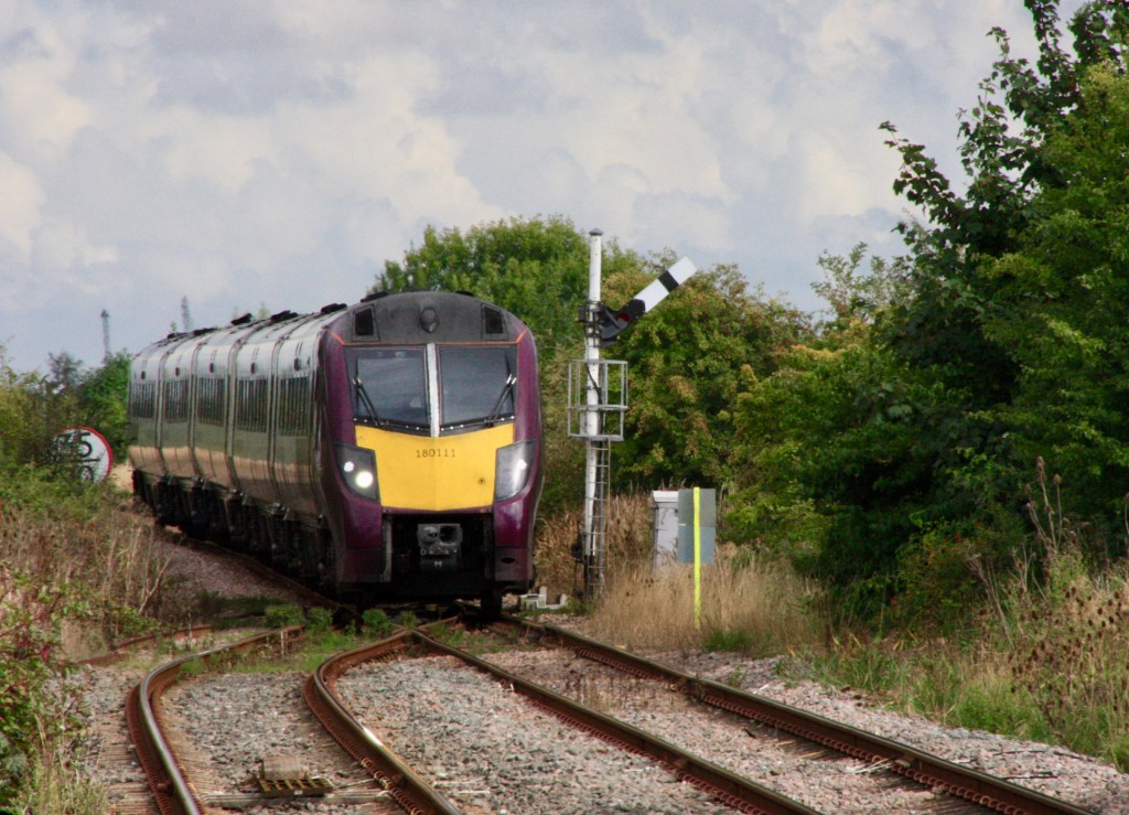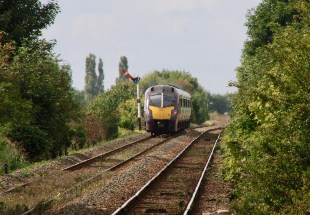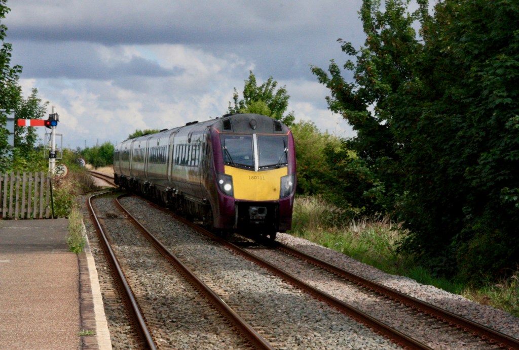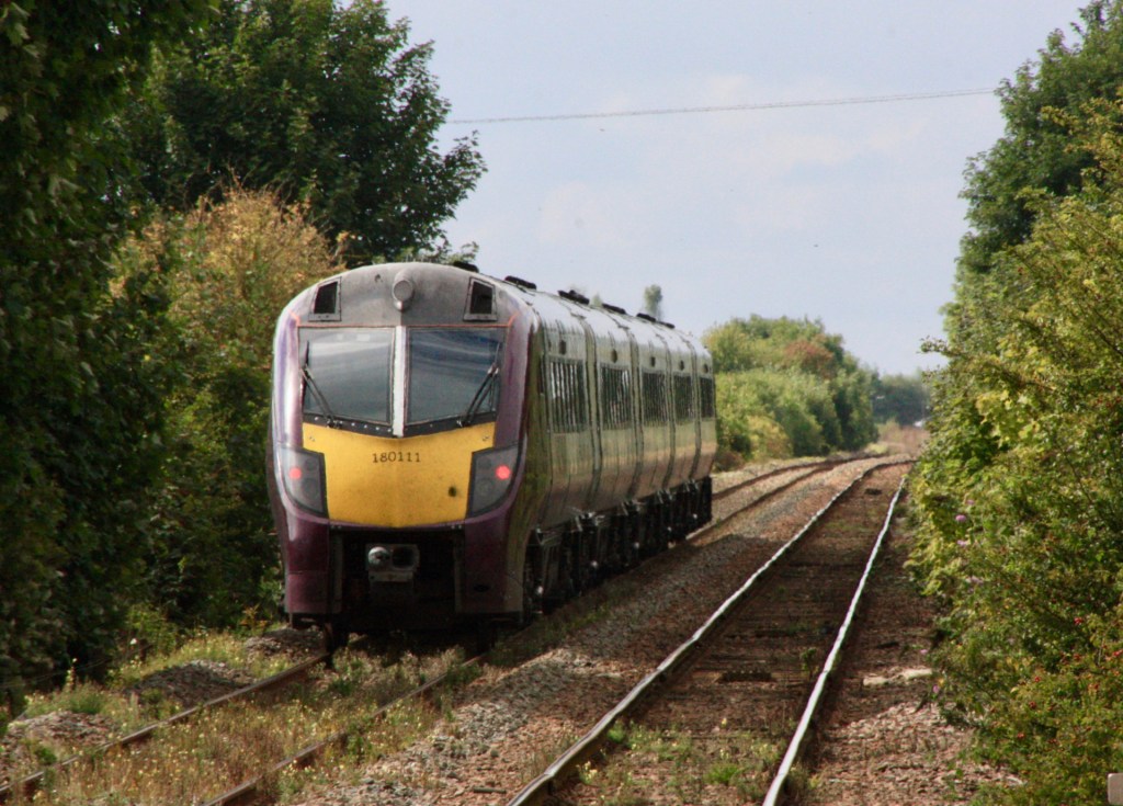 As lightly-loaded 180111 passed me while I stood on the deserted down platform at Hubbert’s Bridge shortly before 14.30 on Saturday it brought an end to the all-too-brief appearance of main line rolling stock on the Poacher Line, and left me wondering whether the 180s would ever return, or could next summer see the appearance of the new Class 810 units?