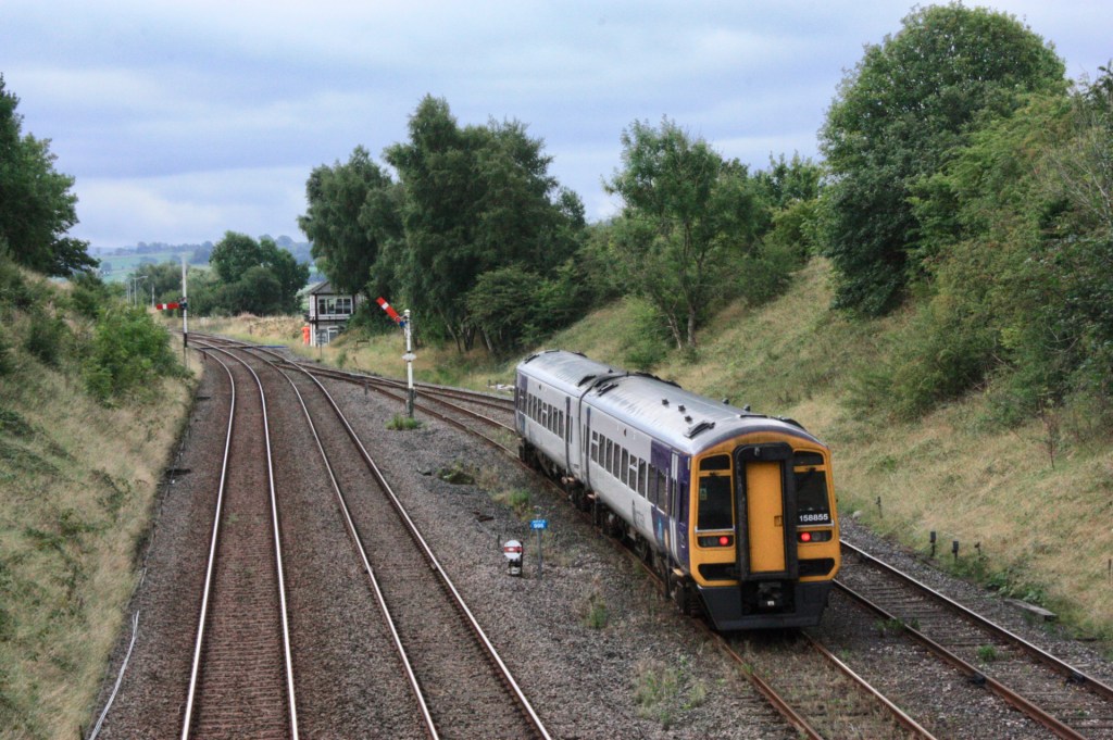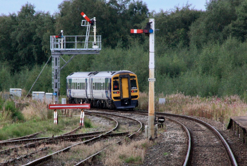 Apart from this and a couple of other shunting arms the only semaphore to the north of the station is down starter HD40, which stands on a bracket some distance north of the platform end, as seen above as it is passed by 158793, with the wooden post shunting signal to the right.