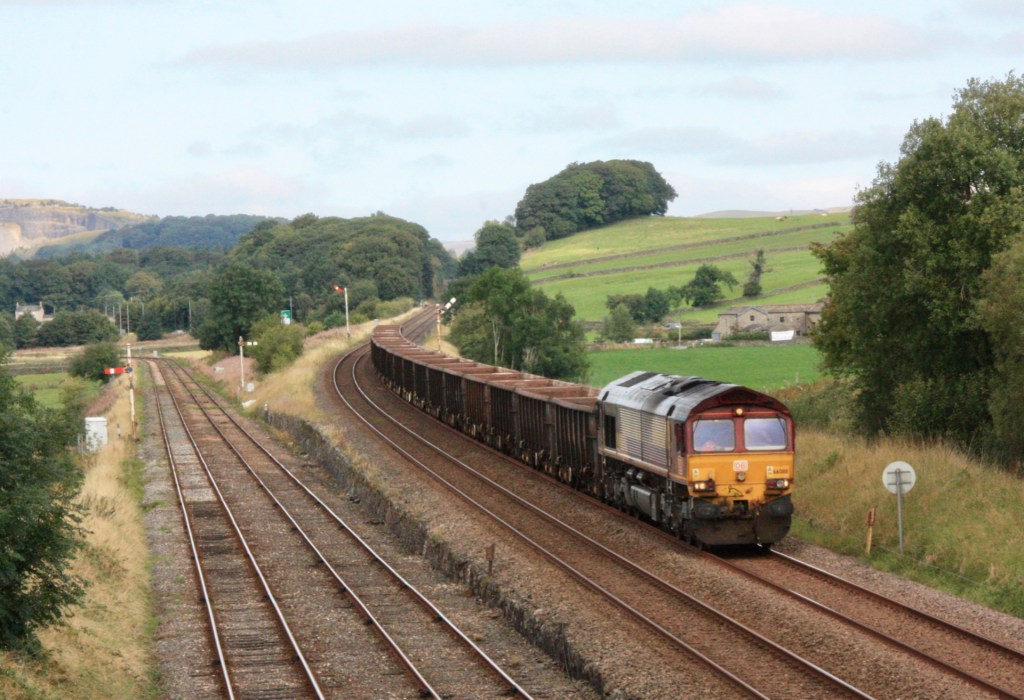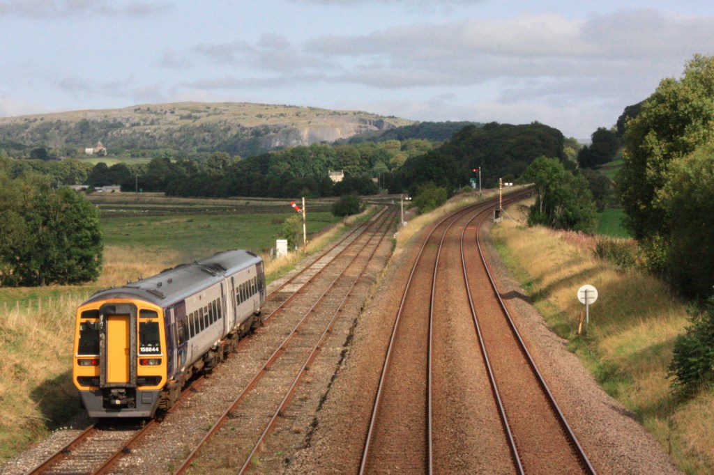 One final photo-spot in Hellifield is a foot crossing of the line that is reached by walking up a path called Haw Lane and brings you to a point very close to signals HD42 (down outer home) and HD25 (up section). Climb over a gate to the right here and walk up for about 50 yards for fine view looking north as a Leeds-bound train approaches HD25, as seen above.