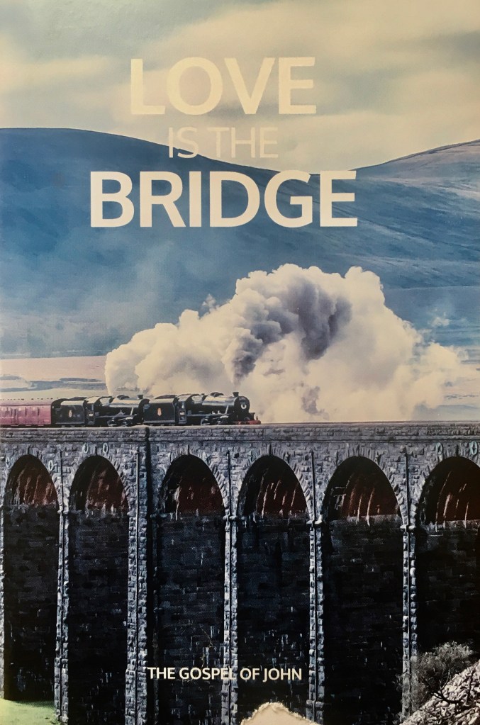 From my base near Giggleswick station it took a rather hazardous 35 minute walk along the busy A65 to a farm crossing overbridge, where the friendly farmer greeted me by handing me an extract from the Gospel of John called Love is the Bridge, with a fine shot of a steam special on Ribblehead Viaduct on its cover!