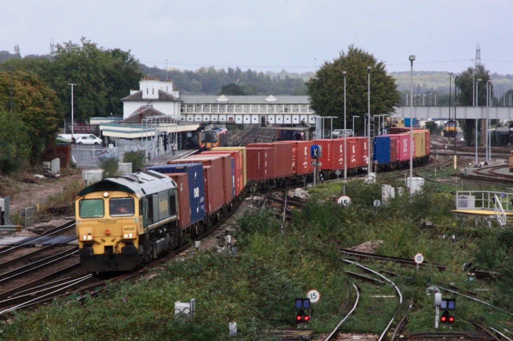 What really adds to the interest at Eastleigh is the extensive freight yards to the east of the station, the large volume of freight traffic passing through on its way to or from Southampton Docks, and continuing rail activity in the railway works.