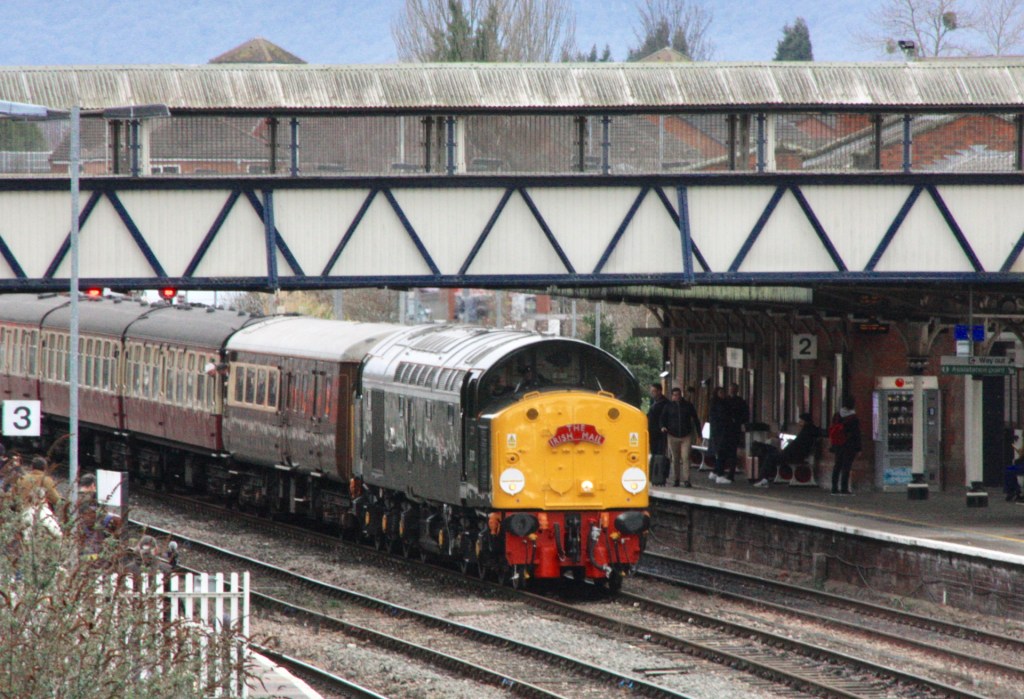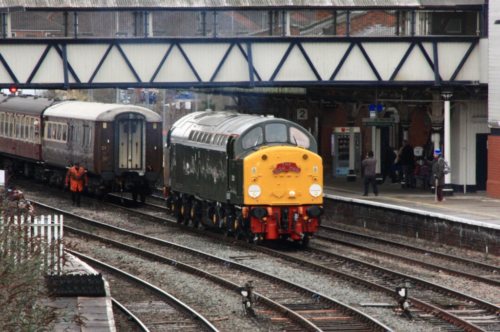 An added bonus was to see arrival of the special train behind green-liveried English Electric Class 40 loco D213 (40013) Andania, bearing an “Irish Mail” headboard, before diesel gave way to steam and D213 returned to its base at Crewe, before working the return leg of the special that evening.
