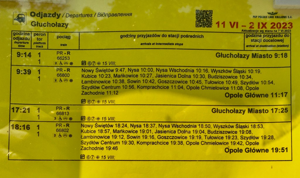 There is a member of PKP staff on duty at Głuchołazy to despatch the regular CD trains, but what seems very odd is that there are timetable posters showing times for the two weekend services between Opole and Głuchołazy Miasto, but no mention at all of the daily CD services between Jesenik and Krnov.
