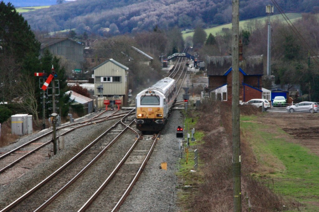 Having read about its installation, I discovered a great new vantage point at Craven Arms during a visit to the remote Shropshire junction on 20 February when I stood on the lightweight and portable FLOW footbridge north of the station to capture shots of trains passing the station, and the rather hideous signal box. My pick from that day shows 67029 approaching with 1W93 from Cardiff Central to Holyhead.