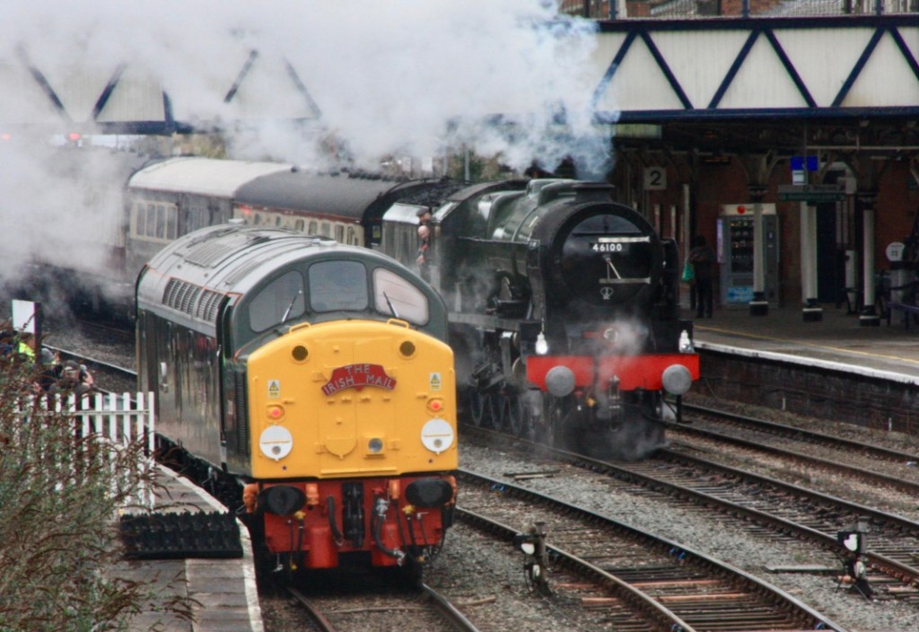 A St. David’s Day (1 March) visit to Hereford was a chance to see both heritage diesel and big steam action, when “Whistler” 40013 (D213) appeared at the head of special working 1Z45 from Holyhead and was replaced by steam loco 46100 Royal Scot for the journey on to Cardiff Central.