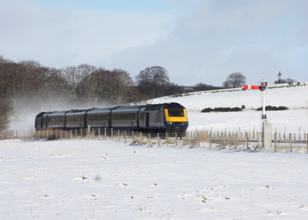 Photographing trains in the snow is a rare treat, but my luck was in on a visit to north-east Scotland on 8 March when I stayed at Insch and managed to persuade a local taxi driver to take me along icy roads to Kennethmont, a few miles away, where I was able to see a ScotRail Inter7City set formed by 43037/164 with 1H65 from Aberdeen to Inverness.