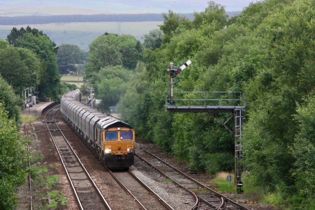 Dramatic natural scenery makes for great photos, so on a 10 July I returned to Edale on the busy Hope Valley Line, where there are some fine vantage points from which to capture the station scene, signal box and semaphores. In this view 66722 passes the station and signal box with 4H73 from Washwood Heath to Tunstead Sidings.