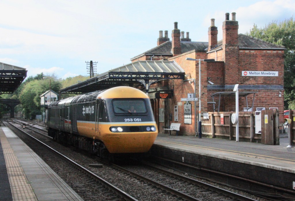 This did not turn out to be my final sighting of the XC HST power cars however, as a visit to Melton Mowbray and its marvellous signal box on 16 October produced two special workings and a total of six ex-XC HST power cars heading for new lives. Here (below) 43184 (253051)/43304 head through the station with 0Q48 from Neville Hill to Great Yarmouth, prior to their export to Nigeria.