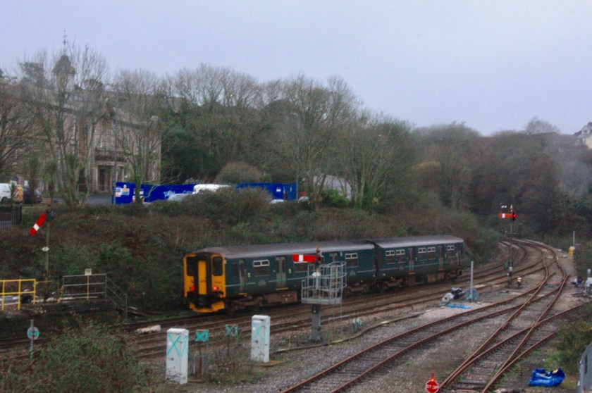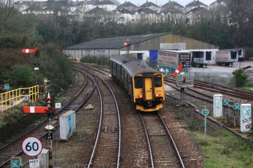 Being at Truro on the first day of ASLEF industrial action (29 January 2024) meant a rare chance to see signal T26 pulled off, when the 13.15 to Falmouth Docks departed from up platform 3 while the bay platform (1) was occupied by the unit (150265) that would have formed the cancelled 12.45 service.