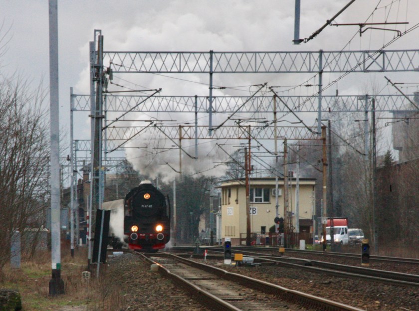 For another attempt at capturing steam action, the following day I travelled as far as the junction at Zbaszyn, where I took a walk to the level crossing east of the station, then followed a path running alongside the railway, with no fence or lineside vegetation to spoil the view, but slightly too close to the line to get anything apart from a head on view of the loco storming towards me.