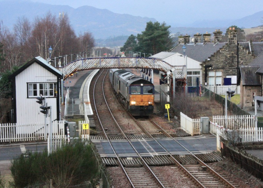 Freight action along the Highland Main Line remains pretty modest, with the only regular service being the train of Tesco containers from Mossend to Inverness, which is currently scheduled to pass Kingussie on its outward journey at 08.07, and pass again at 16.14 on its southbound working.