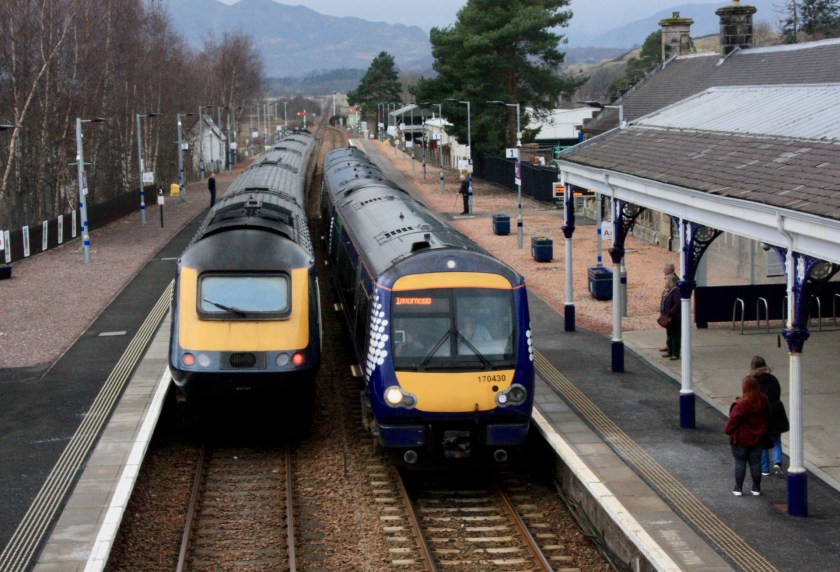 Besides these two services, the other passenger services of particular interest are workings between Edinburgh Waverley/Glasgow Queen Street and Inverness formed by Scotrail Inter7City HST (2+4 and 2+5) sets, with the non-HST services between these three cities being worked by Class 158 or 170 units.