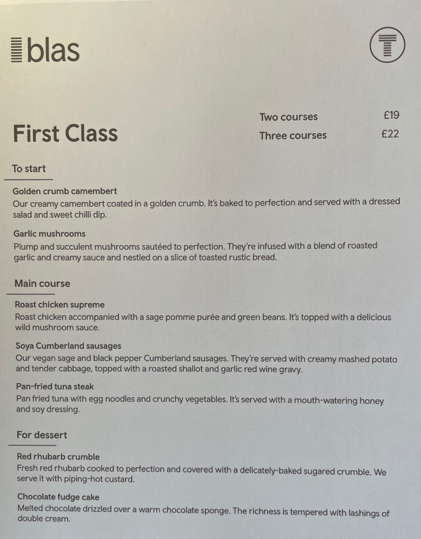 The three courses cost just £22.00, with a couple of small cans of Sauvignon Blanc (£4.50 each) bringing my total bill to a modest £31.00, which compares to the current £39.50 (excluding wine) for three courses in GWR Pullman Dining, though the latter includes a “free” upgrade to first class for anyone travelling with a standard class ticket.