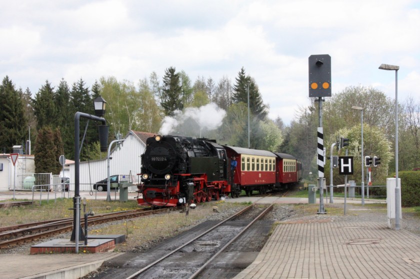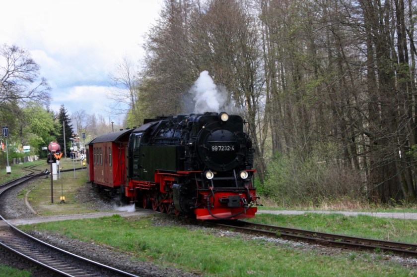 After arrival at Alexisbad I took one of the three services each day that run up the short branch to Harzgerode, before continuing on that railcar to the junction at Eisfelder Talmühle, where there was the chance to see 99-7232 approaching with the near empty 11.57 from Wernigerode.