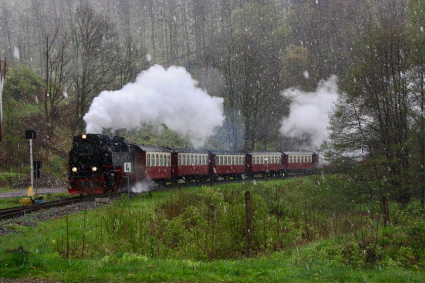 Rounding off my three day Harz tour on Friday, 19 April, I was glad to have visited Schierke on the previous day as the weather had deteriorated badly and my shot (above) of 99-7232 approaching Eisfelder Talmühle with the daily Nordhausen-Brocken working was taken during a heavy downfall of snow.
