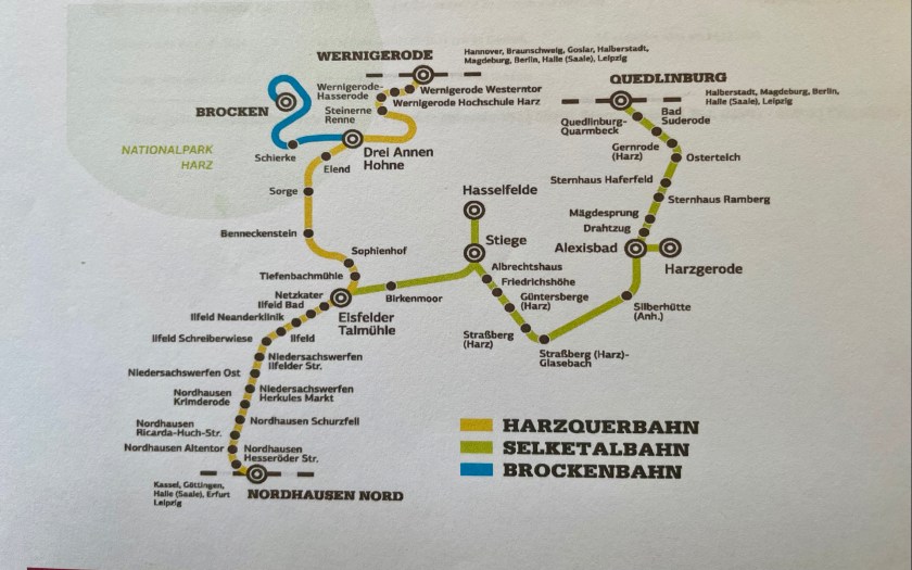 As I have described in previous HSB features, the Harz system comprises three inter-connected railways forming a Y-shape, busiest of which by far is the 34km/21 mile Brockenbahn from Wernigerode up the 1125m/3,691ft Brocken Mountain. Premium fares are charged on the Brocken route, and the final section is not included in the Kurzer Urlaub pass.