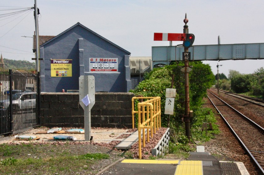 For now there is still time to appreciate the quintet of lower quadrant semaphores at Pembrey & Burry Port, which in the up (eastbound) direction are outer home PY82 at the end of platform 1 and up inner home PY81 close to the signal box and protecting the level crossing.
